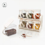 مجموعة عملية مكونة من 6 علب شفافة تحفظ نكهة البهارات والتوابل لأطول فترة. مثالية للمطابخ الصغيرة أو للاستخدام الأساسي، مع رف أنيق وملعقة مدمجة لكل علبة.