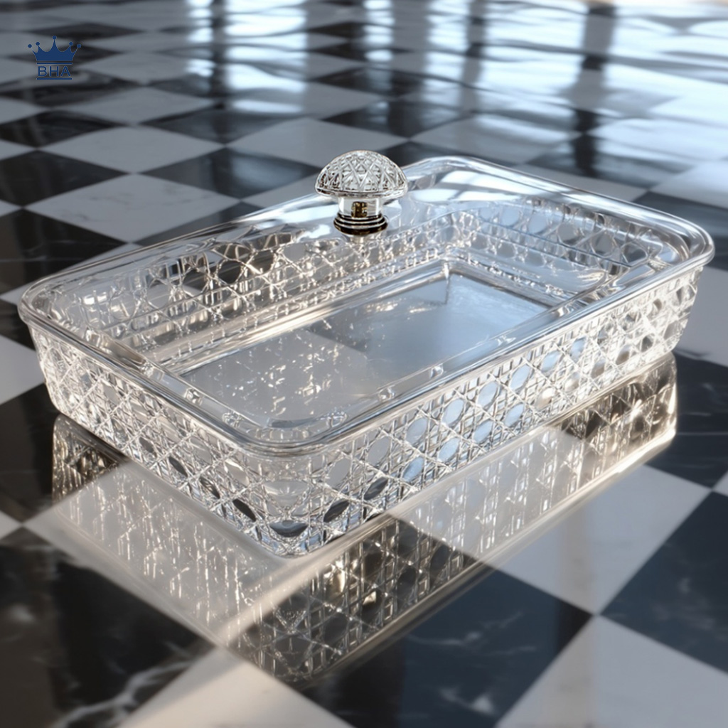 أطباق أكريليك شفافة بجودة عالية جداً، مصنوعة من أكريليك نقي، أنيقة ومثالية للضيافة بأشكال متعددة.